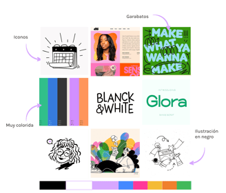 Venía de usar una paleta básica de negro y blanco junto con algún tono pastel, pero esta nueva marca me pedía algo más de brillo y de magia, por lo que me decidí por una paleta más saturada y con más opciones para representar esa parte creativa y llena de posibilidades que me caracteriza.