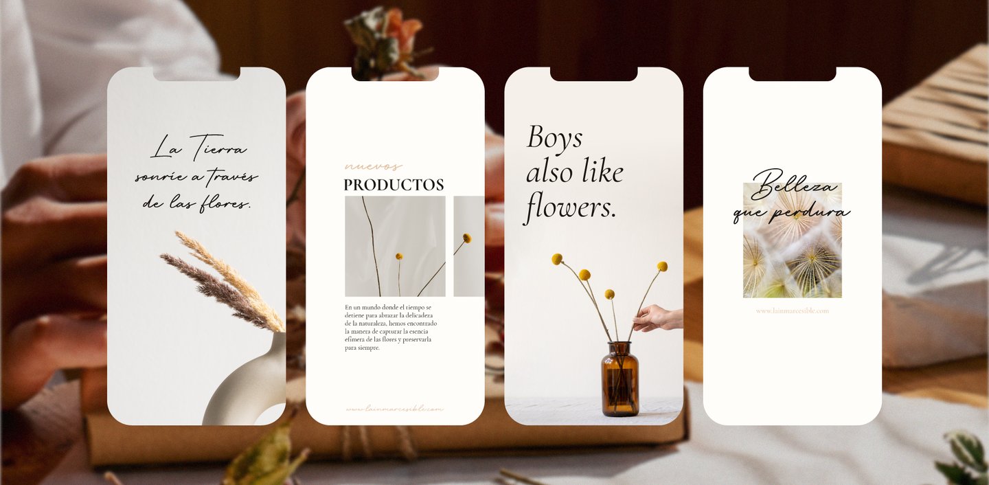 Mientras estudiaba diseño gráfico tuve la oportunidad de crear la identidad visual de La Inmarcesible, un proyecto ficticio para una floristería especializada en flores preservadas. Más de diez años después, he querido rediseñar esta identidad para otorgarle un aire más minimalista, elegante y artesanal, manteniendo la esencia cálida que siempre ha caracterizado a la marca.